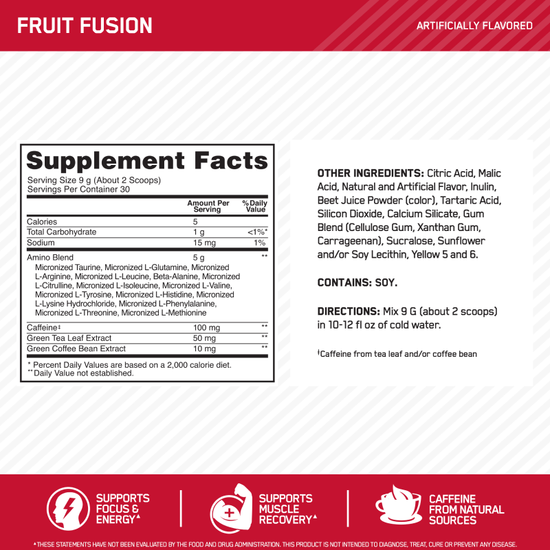 Mix up ESSENTIAL AMIN.O. ENERGY™ anytime you want a fruit flavored or coffeehouse inspired boost of energy and alertness. You can determine what's appropriate for any situation, adding a 2-scoop serving to water for an afternoon pick-me-up or increasing the amino acid matrix to 10 grams with a 4-scoop pre-workout drink that delivers 200 mg of caffeine from green coffee and green tea extracts.
