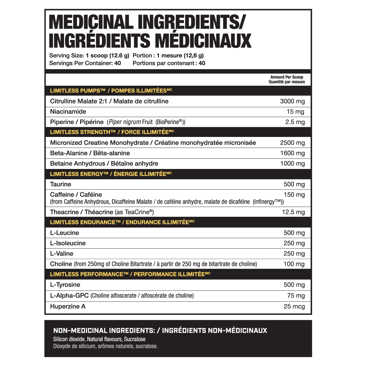 This loaded formula, complete with over 20 grams of scientifically backed ingredients, redefines your workouts for unprecedented results. Boost power, pumps, performance and energy. Increase focus, build strength and lean muscle while improving endurance and delaying fatigue. Enjoy tempting, clean flavors with our NextGen Flavor™ Technology. Vegan, gluten-free, and dye-free, Limitless is your key to unlocking peak performance.