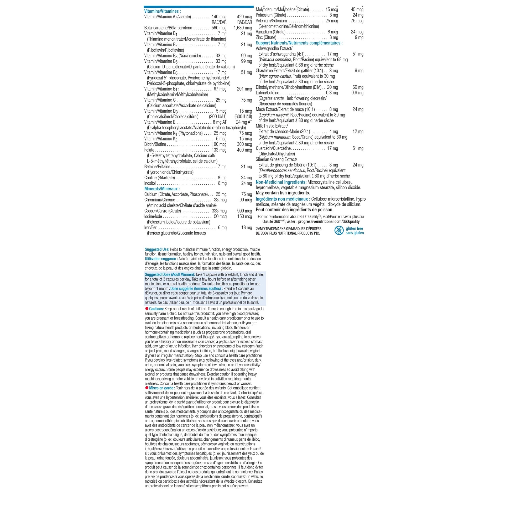 Progressive 100% Complete MultiVitamin for Active Women is designed for women on the go. Whether you exercise regularly, work long hours, raise a family or any combination of the above, your body needs the support of an Active MultiVitamin formula. This improved formula features a complex of supporting nutrients designed to address women’s health needs, including promoting healthy estrogen balance. These supporting nutrients include Quercetin, DIM, Chastetree, Maca, Ashwagandha, and Siberian Ginseng.